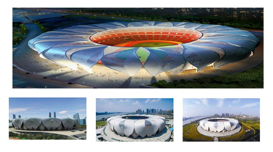 案例詳情:主體育場(chǎng)外形似蓮花,造型動(dòng)感飄逸,由28片大花瓣和27片小花瓣組成。據(jù)介紹,該造型取意于杭州絲綢紋理與紡織體系,建筑體態(tài)源于錢塘江水的動(dòng)態(tài),擁有簡(jiǎn)潔的花瓣單元,猶如一朵美麗的蓮花綻放于錢塘江畔。使用鋁合金的原材料,充分體現(xiàn)材料的可塑性強(qiáng),強(qiáng)度大,能夠滿足設(shè)計(jì)師的各種設(shè)計(jì)思路。并且具有耐腐蝕、抗紫外線、長(zhǎng)時(shí)間不褪色等特點(diǎn)。
